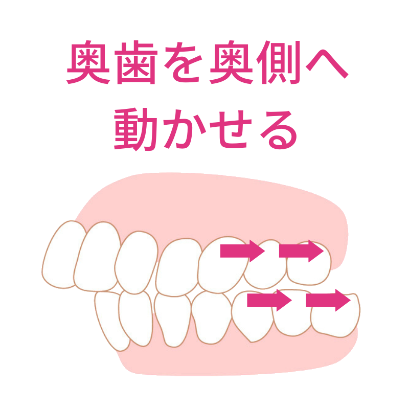 一方、当院で実施している「インビザライン・ライト」や「インビザライン・フル」では、奥歯を奥に動かすことで、前歯を並べるスペースを確保します。