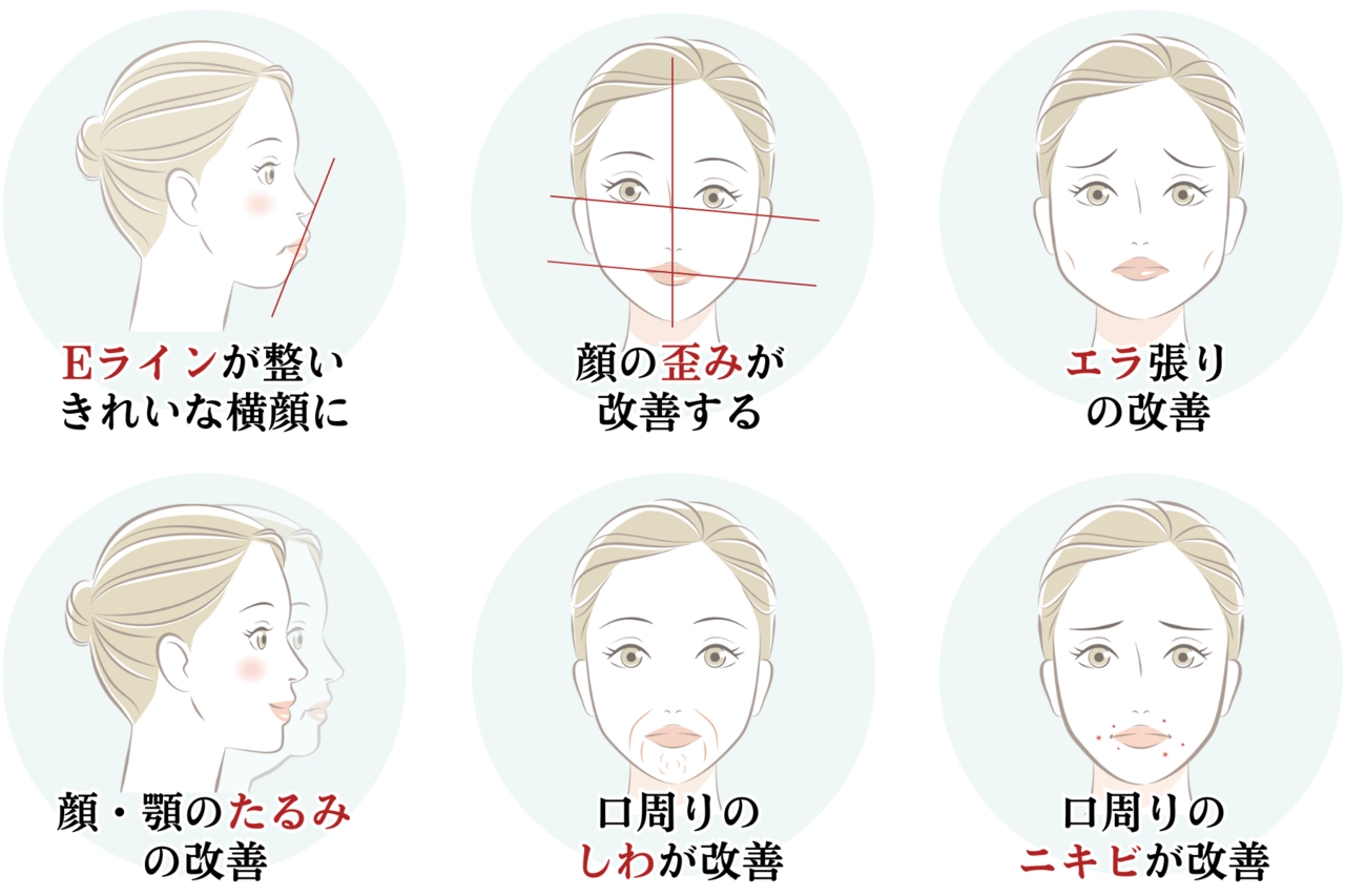 また奥歯の噛み合わせが原因で、Eラインがずれたり、エラ張りやしわ・たるみが出たりしている人は、前歯だけでなく奥歯を矯正することで、これらの改善が見込めます。