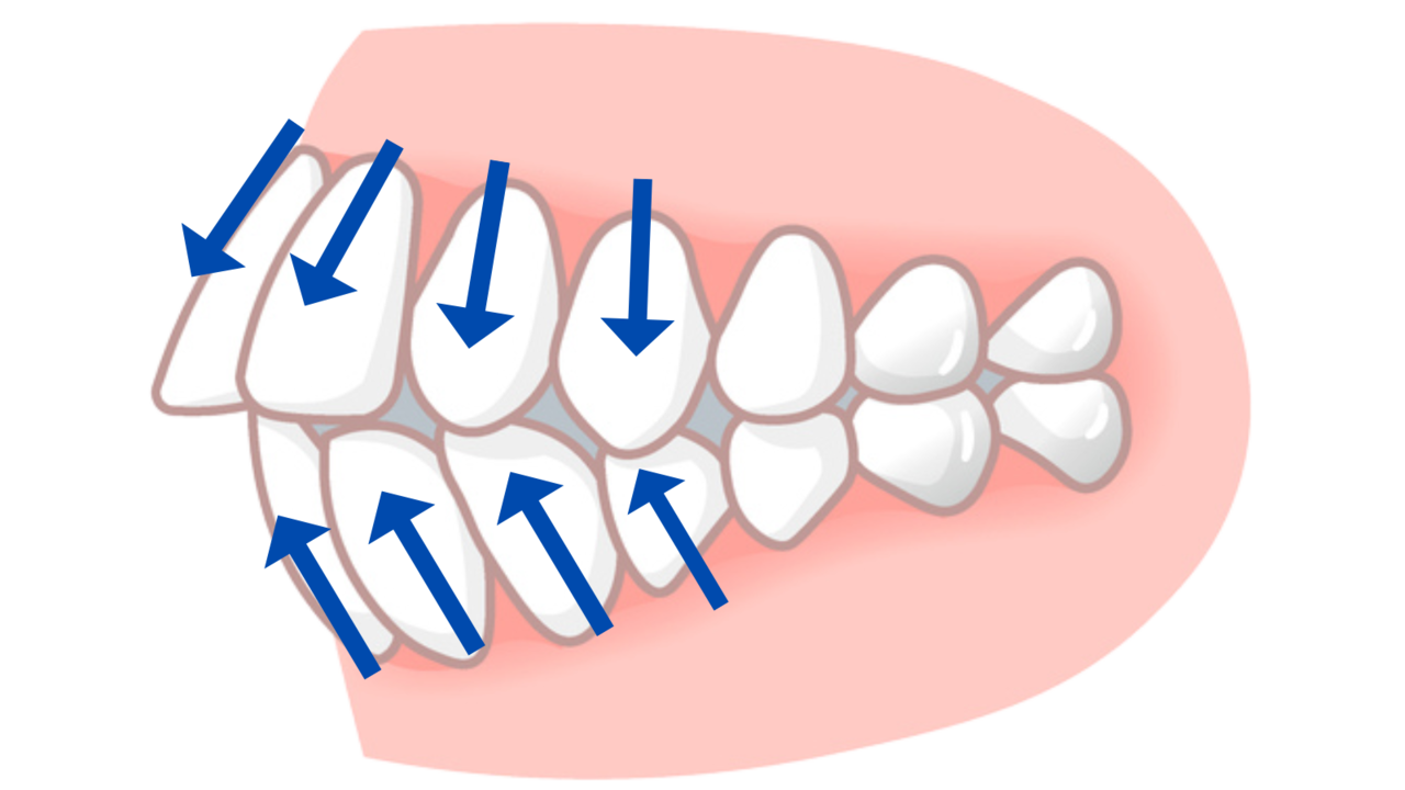 もしそのまま矯正を続けると、スペースが足りない状態で無理矢理に歯を並べますから、右図のように前に広がってしまいます。