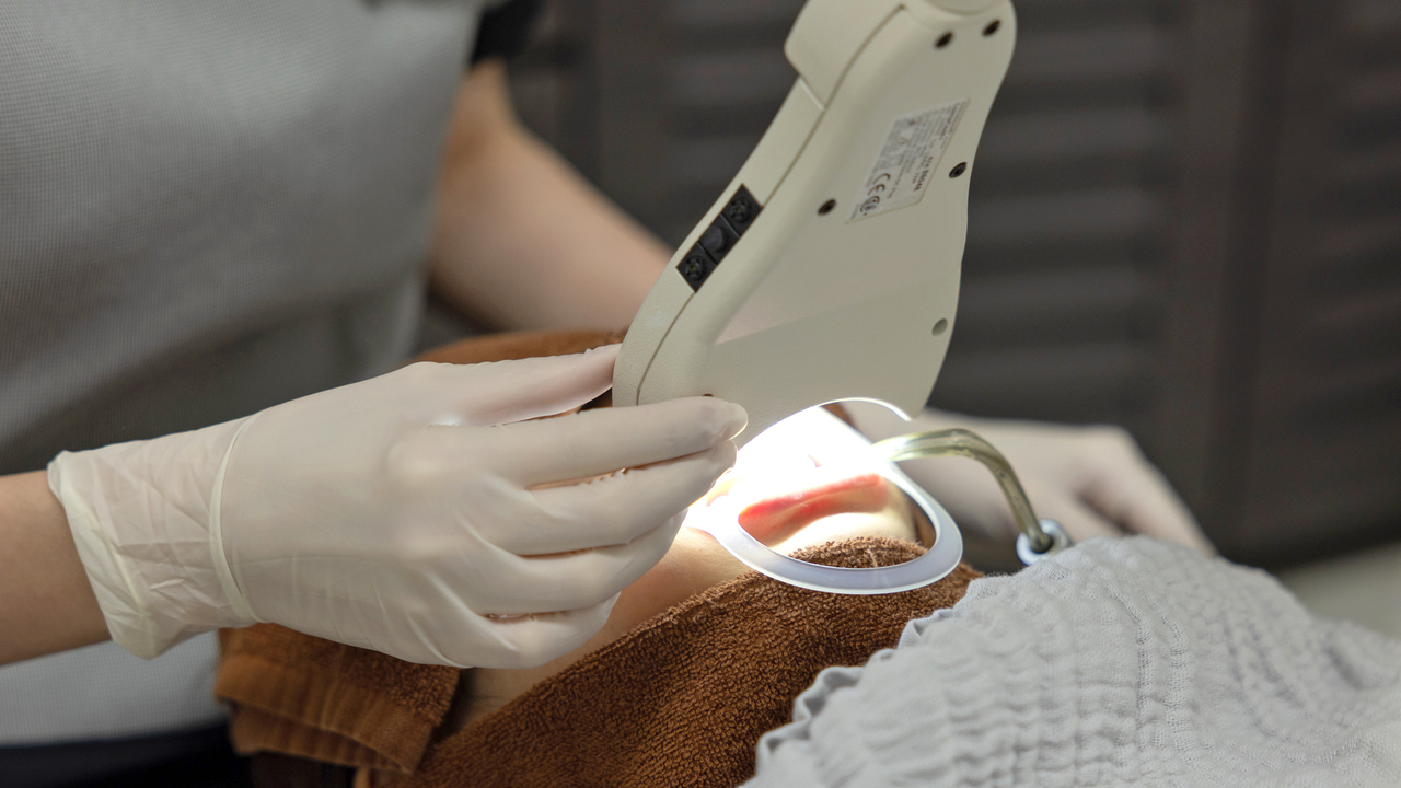 治療の説明:歯科医院内で行うホワイトニング。歯の表面に薬剤を塗り、光を照射して歯を白くする方法です。