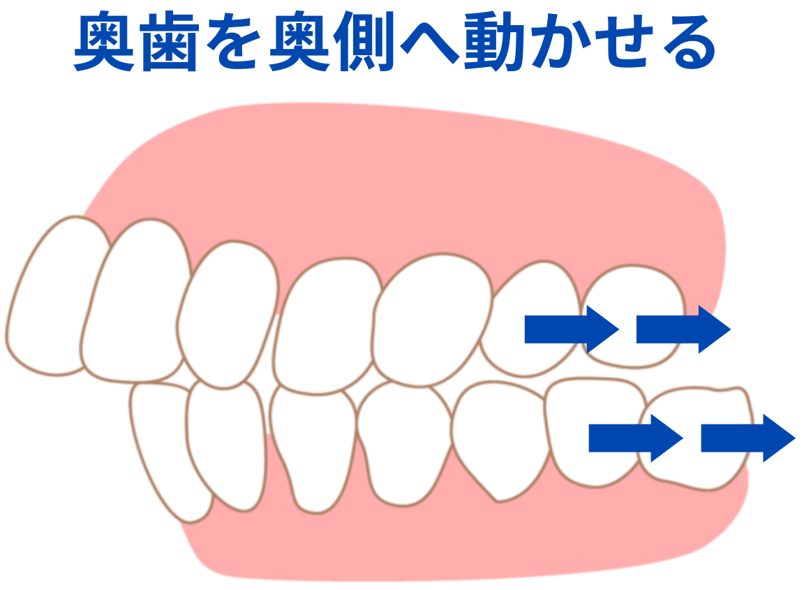 親知らずを抜いたスペースに奥歯を順繰りに動かすことで、前歯を並べるスペースを確保できます。